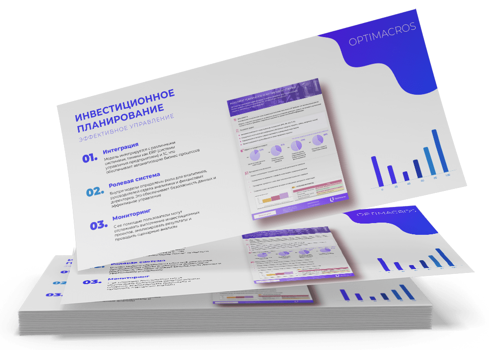 Модель «Инвестиционное планирование машиностроительной компании» позволяет работать совместно с другими подразделениями, планировать финансирование проектов, оценивать и контролировать инвестиционную деятельность компании, интегрироваться с другими системами. Платформа также обеспечивает визуализацию и оперативный контроль исполнения планов. Благодаря широкому функционалу, включающему в себя ролевую систему и возможность выгрузки отчетов, модель станет незаменимым инструментом для эффективного управления инвестициями.