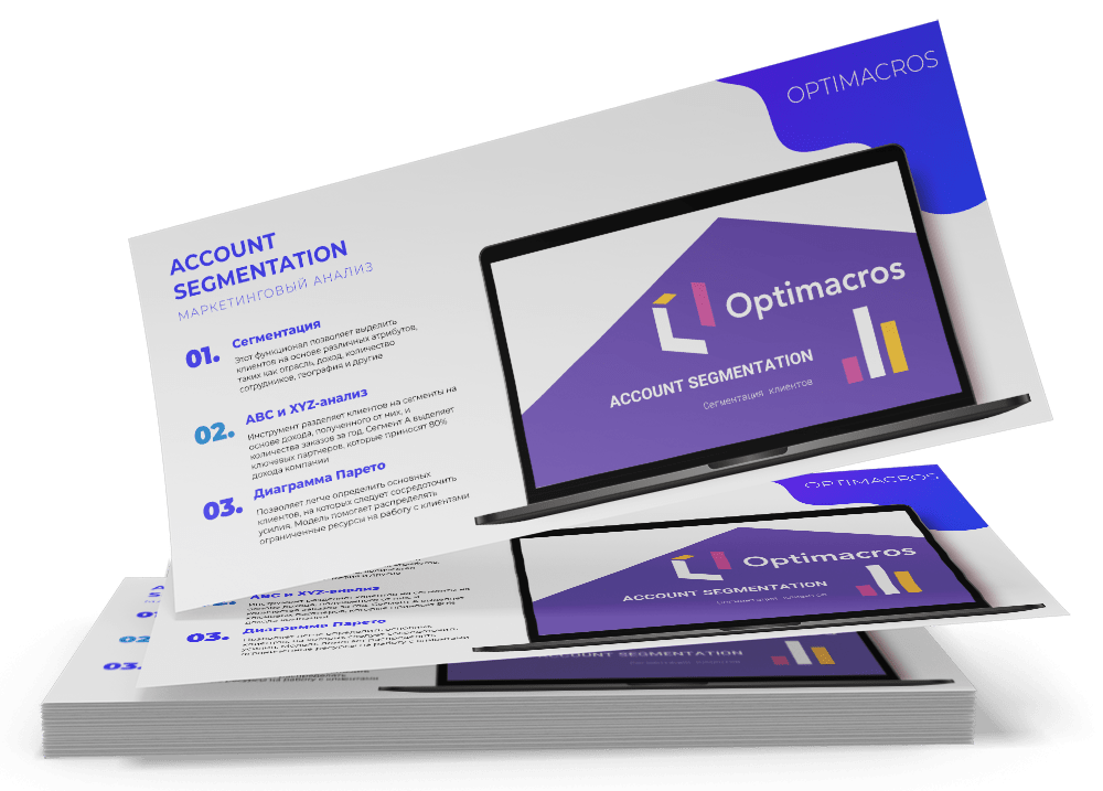 Account segmentation — функционал, позволяющий определить действующих клиентов, которые могут увеличить доход вашей компании. Его реализация на платформе Optimacros помогает выделить ключевых партнеров, разделить и сгруппировать их по таким атрибутам, как: отрасль, доход, количество сотрудников, география или по любому другому показателю.