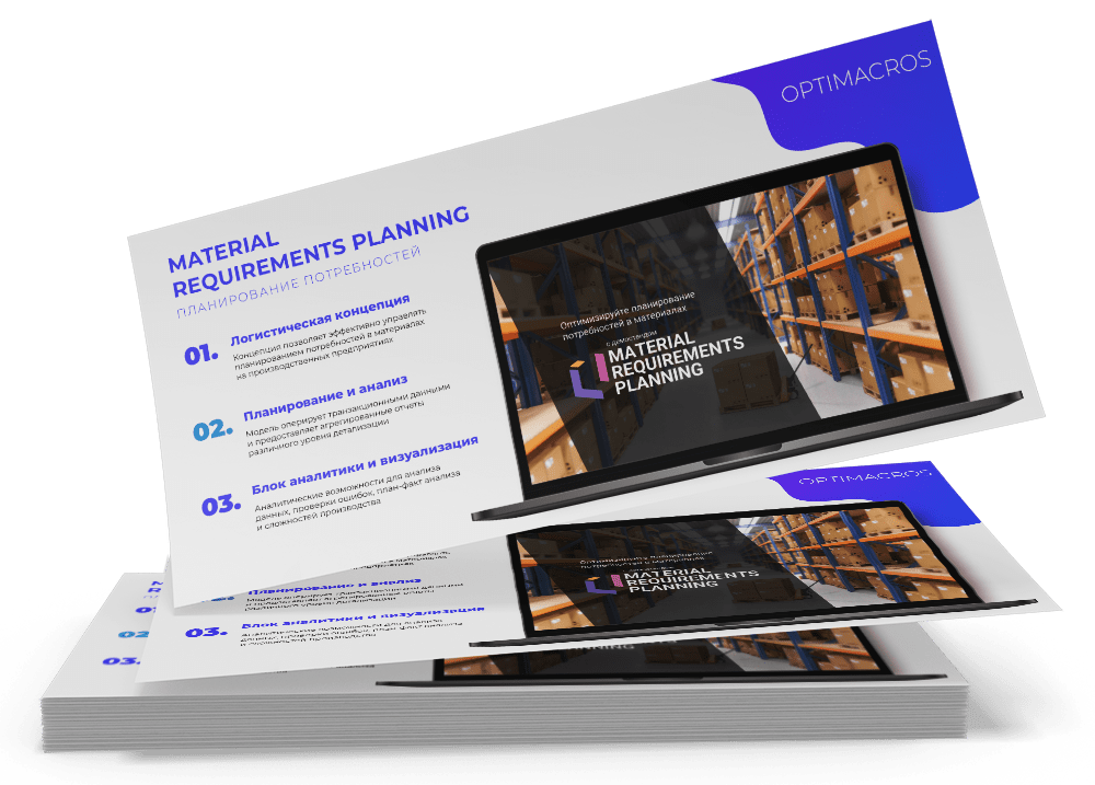 Модель Material Requirements Planning, созданная аналитиками компании Optimacros имеет в своей основе логистическую концепцию MRP, которая является одной из наиболее популярных в мире для планирования потребностей в материалах.
