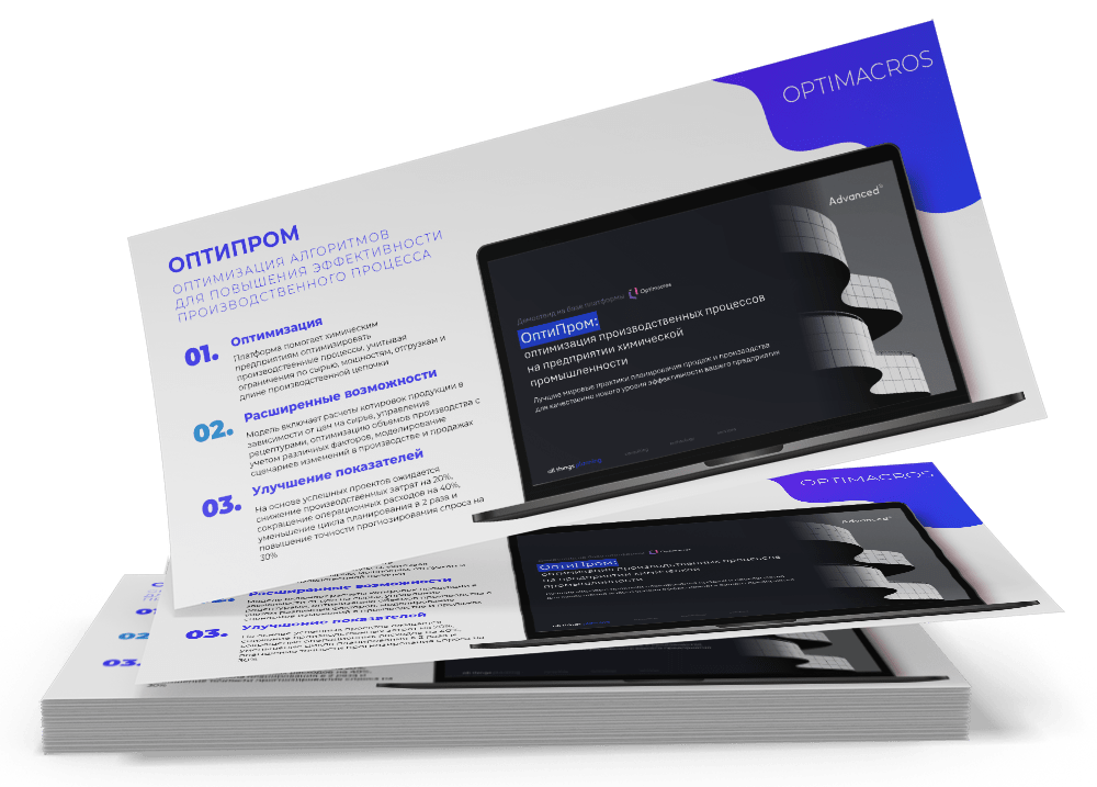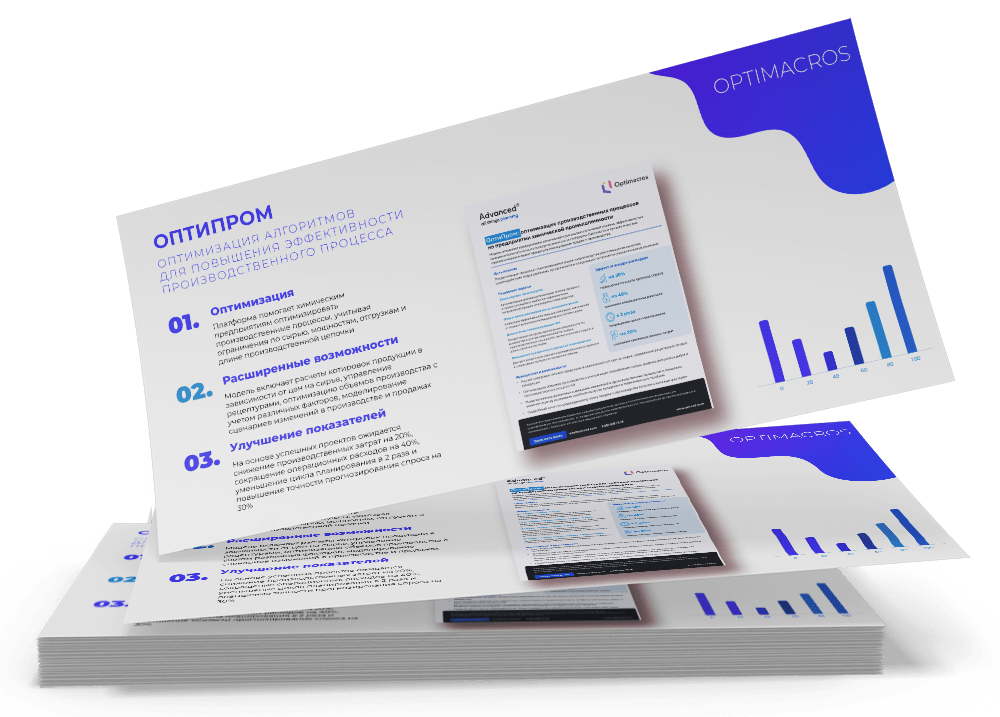 «ОптиПром» демонстрирует возможности встроенных оптимизационных алгоритмов Optimacros для повышения эффективности производственного процесса на химическом предприятии с учетом ограничений по остаткам сырья, производственным мощностям, возможностям отгрузок и длине производственной цепочки.